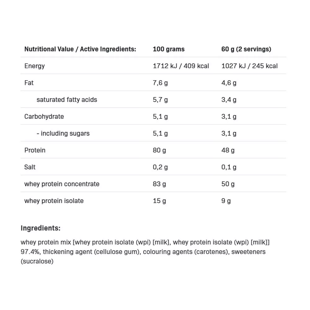 Contains naturally occurring sugars. This product is intended for physically active individuals over 18 years of age. Do not use if you are allergic to any of the ingredients. This product should not be used by pregnant or breastfeeding women. Do not exceed the recommended daily dose. This dietary supplement should not be used as a substitute for a varied diet. A balanced diet and a healthy lifestyle are recommended. *E104, E124 – may have an adverse effect on activity and attention in children. The protein content of the product is given in dry matter.