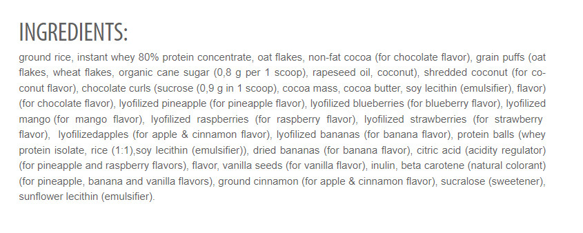 This product is absolutely unique in sports and functional nutrition! The combination of whey protein 80% concentrate, oat flakes and rice guarantees fully-fledged meal with ideal content of the best digestible protein and carbs! These basic ingredients are moreover enriched with inulin from chicory root.