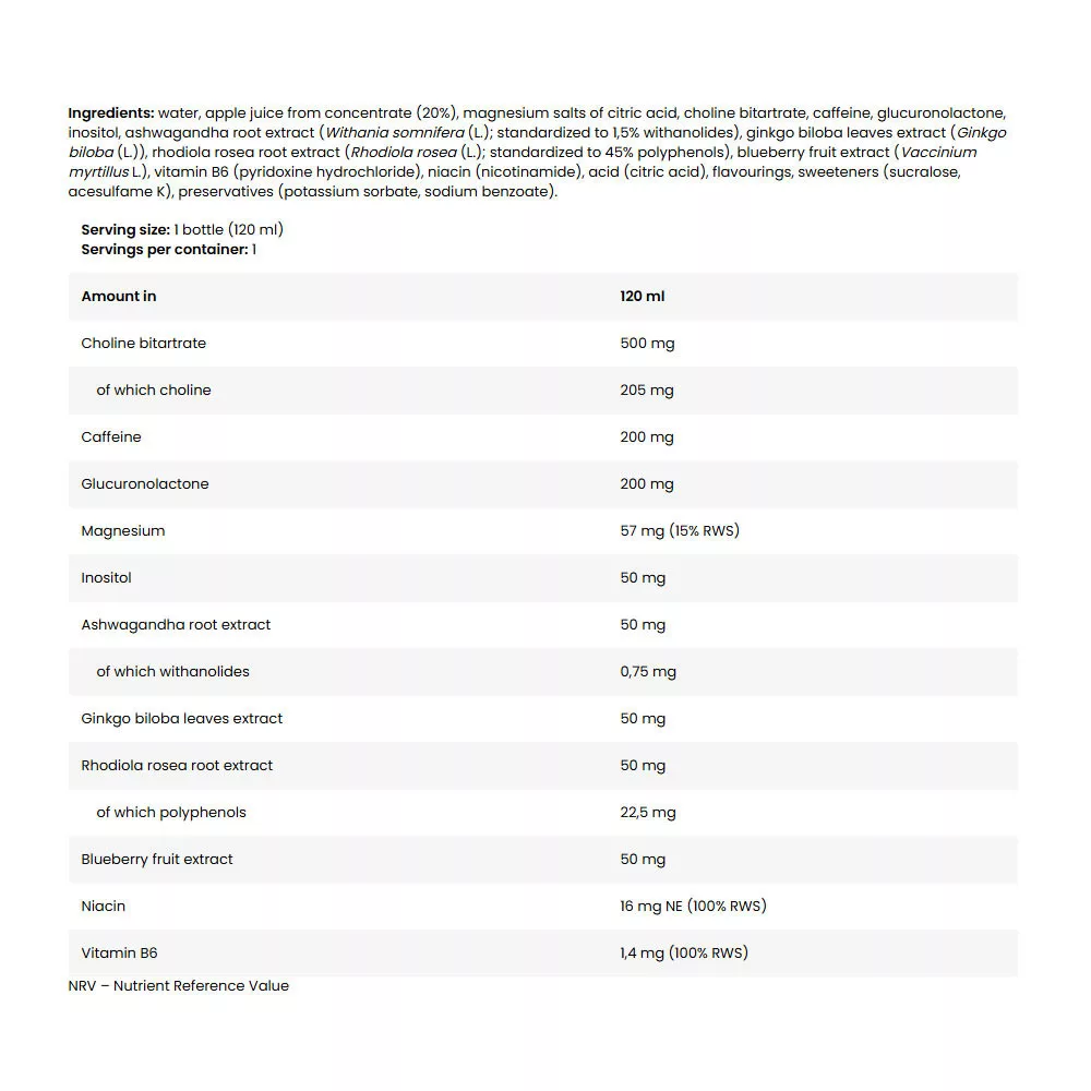 Food supplement. Energy drink. Pasteurized. With sweeteners. Contains caffeine (200 mg / portion 120 ml 166,7 mg / 100 ml), Not recommended for children or pregnant women. Liquid food supplement with cola flavour containing a.o. caffeine and plant extracts, intended for adults.