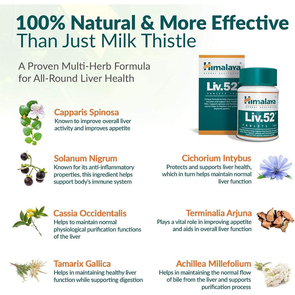 Usage of Himalaya Liv.52 (LiverCare) can help regulate levels of enzymes and optimize assimilation and improve the functional efficiency of the liver. Liv.52 (LiverCare) helps restore the functional efficiency of the liver by protecting the hepatic parenchyma and assist in promoting hepatocellular regeneration. It facilitates rapid elimination of acetaldehyde, the toxic intermediate metabolite of alcohol metabolism, and helps ensure protection from alcohol-induced hepatic damage. Liv.52 (LiverCare) helps diminish the lipotropic activity in chronic alcoholism, and prevents fatty infiltration of the liver. In pre-cirrhotic conditions, Liv.52 (LiverCare) helps arrests the progress of the disease and prevents further liver damage. As a daily health supplement, Liv.52 (LiverCare) helps improves appetite, the digestion and assimilation processes, and promotes weight gain.