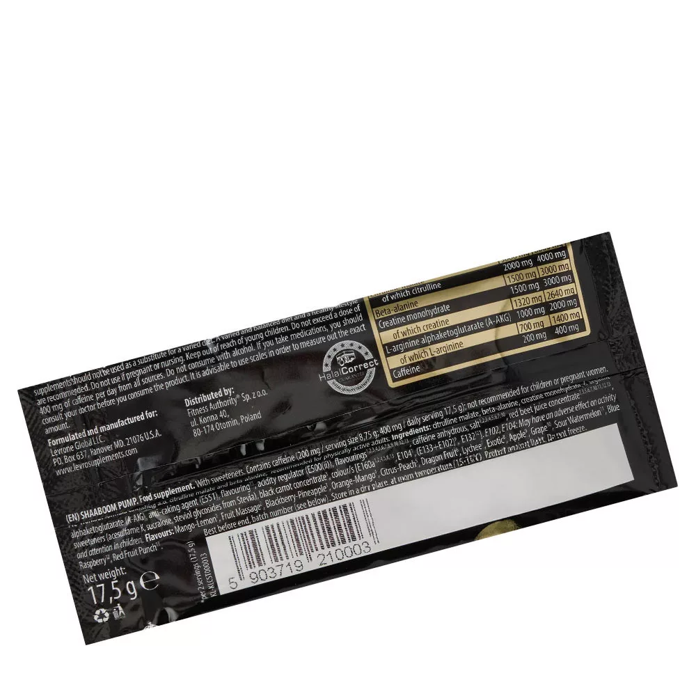 The Levro SHABOOM Pump from the Black LINE range is a modern and comprehensive pre-workout product designed to stimulate the body and maximise your workout. Recommended for physically active adults for intense workouts. Each serving contains 6000 mg citrulline malate, 3000 mg beta-alanine, 2000 mg arginine AKG, and 3000 mg creatine monohydrate!