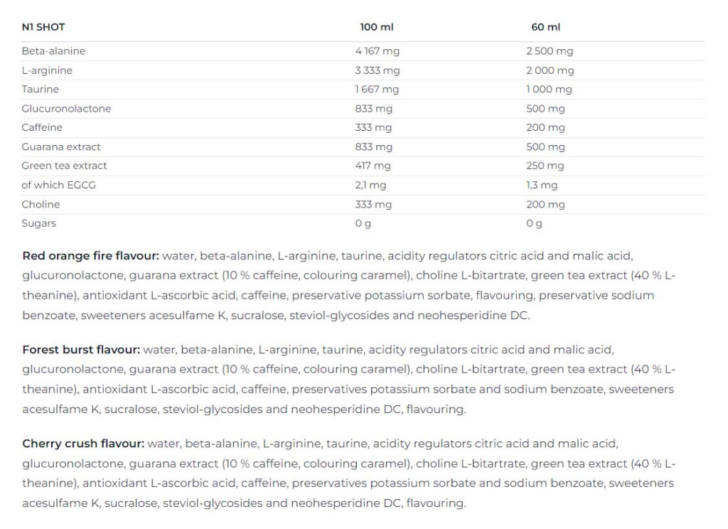 Contains caffeine (200 mg/ 60 ml) – not suitable for children, pregnant or nursing women. The product is mainly intended for adult athletes. Does not replace a varied diet. Keep out of reach of children!