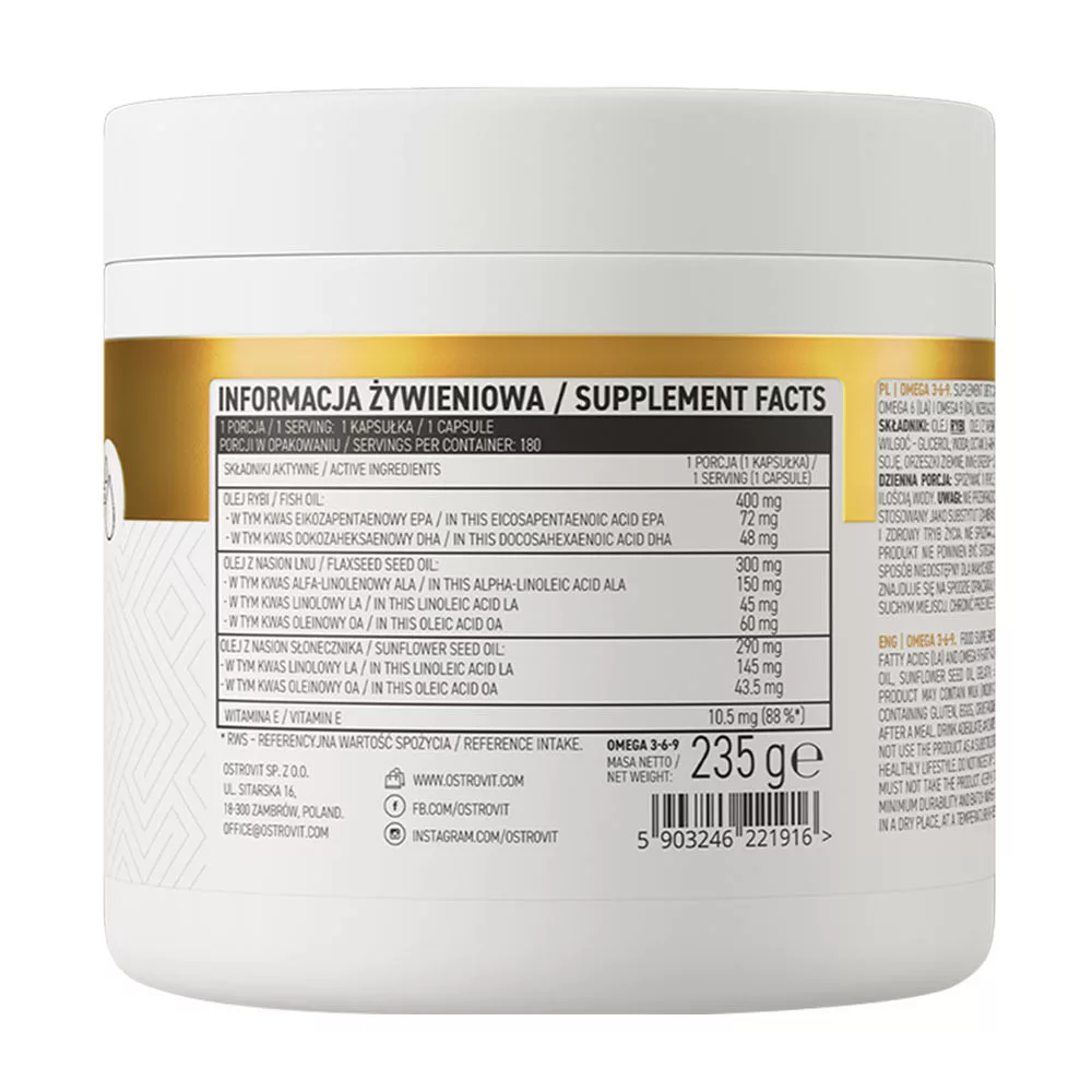 OstroVit Omega 3-6-9 is a dietary supplement that is a source of valuable unsaturated fatty acids omega-3, as well as omega-6 and omega-9, and additionally provides the body with vitamin E. It is a preparation in the form of easy-to-swallow capsules, which is recommended especially for people who have an increased demand for the above-mentioned compounds.
