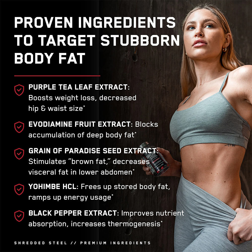 Shredded Steel® takes a comprehensive and holistic approach to solving your fat loss dilemma using a multi-pronged attack on unwanted body fat. Included in Shredded Steel® is an arsenal of premium quality ingredients that attacks weight loss from multiple fronts, including compounds that increase fat mobilization, enhance fat oxidation, and boost energy expenditure.