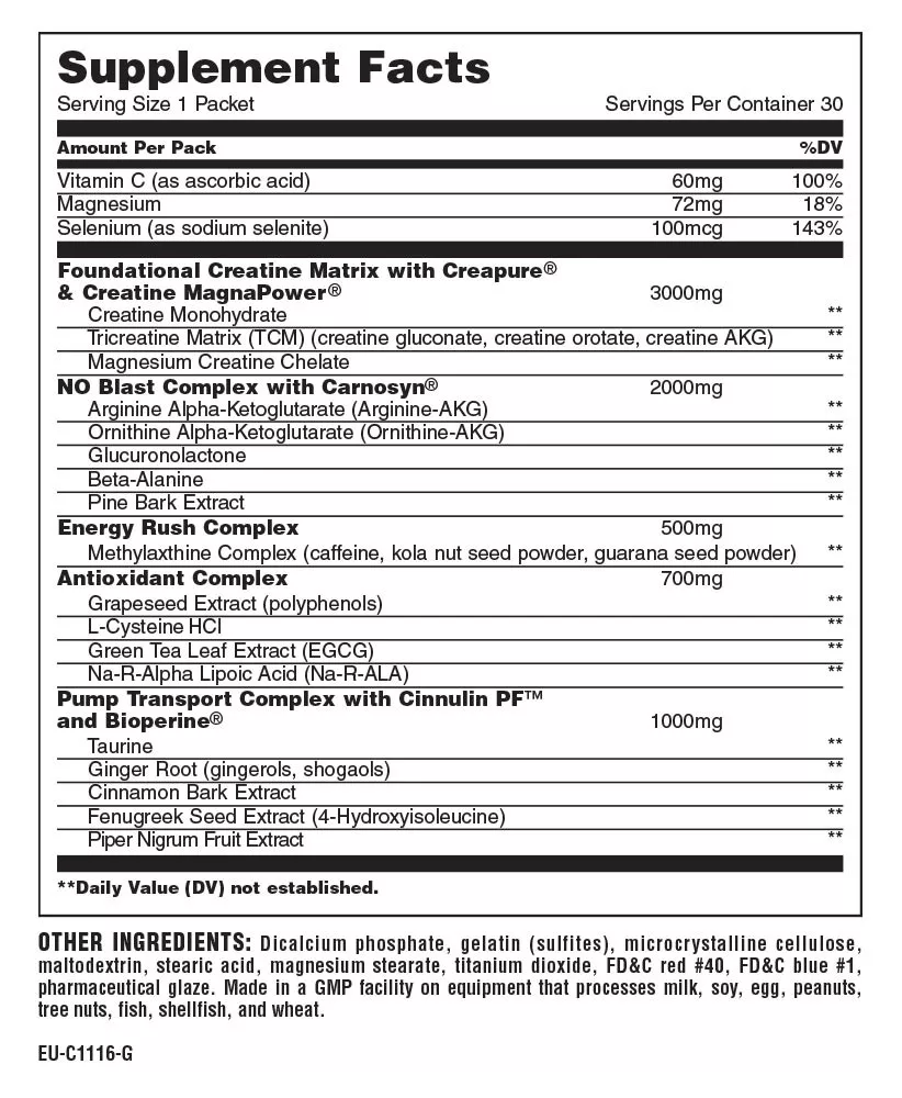 In addition to a full daily dose of creatine (patented and proven forms including MCC, Creapure and TCM, you also get: (1) a fusion of a swelling NO Blast Complex (2) a shocking Energy Rush Complex (3) a special antioxidant blend needed for NO products and (4) potent cell volumizers, all wrapped up in a special nutrient transport complex. From top to bottom, Animal Pump is complete and comprehensive--you get everything you need, precisely dosed in a single convenient "pack".