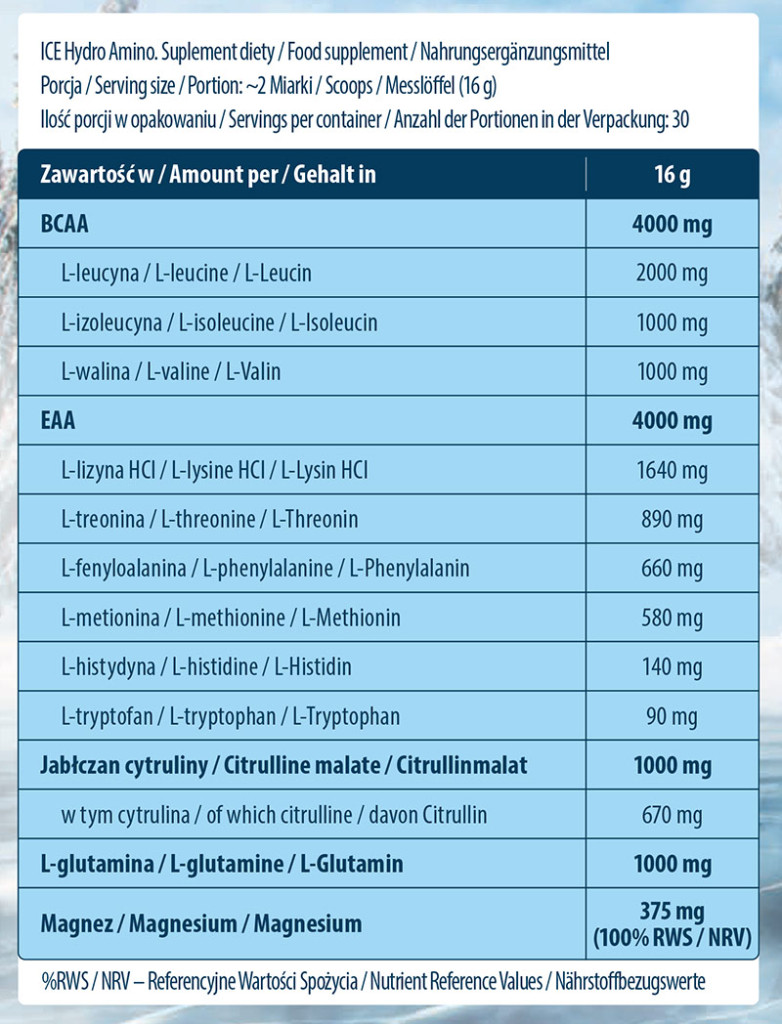Ice Hydro Amino - a supplement rich in amino acids containing, EAAs, BCAAs, L-Glutamine and Citrulline.