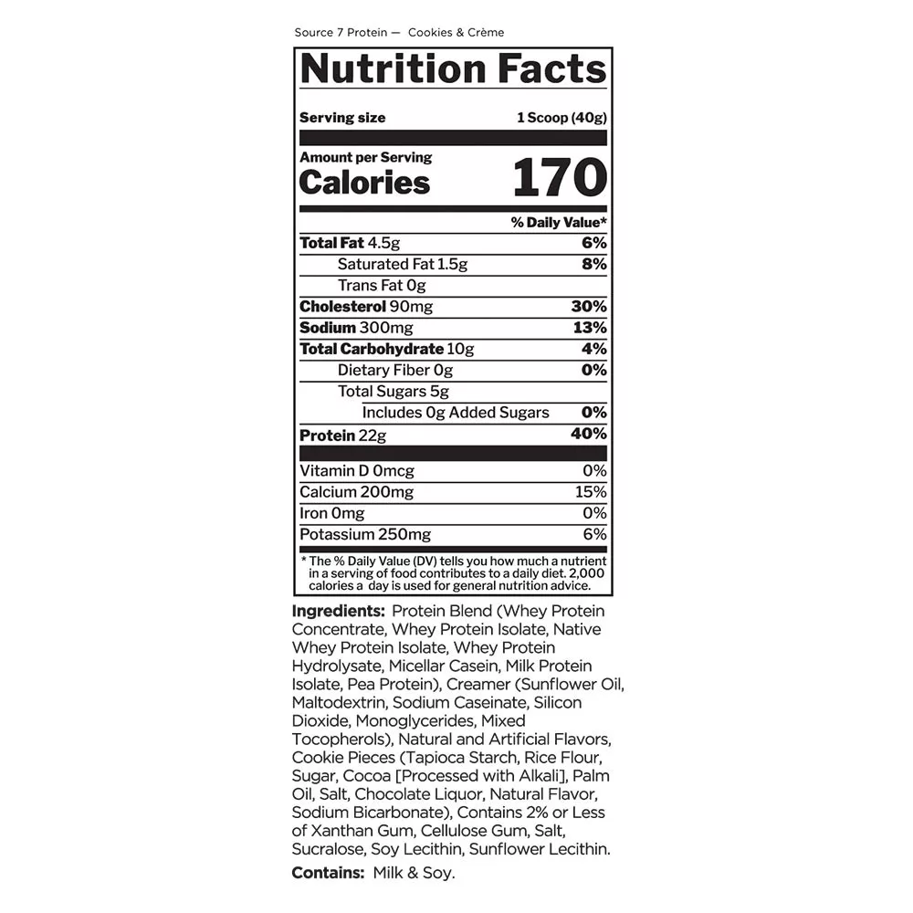 Mix about one scoop of Source 7 Protein with 6–8 oz.(200-250 ml) of cold water, milk, or your favorite beverage in a blender, shaker cup, or a glass with a spoon. For added variety, blend with fruit or mix into cereal or yogurt.