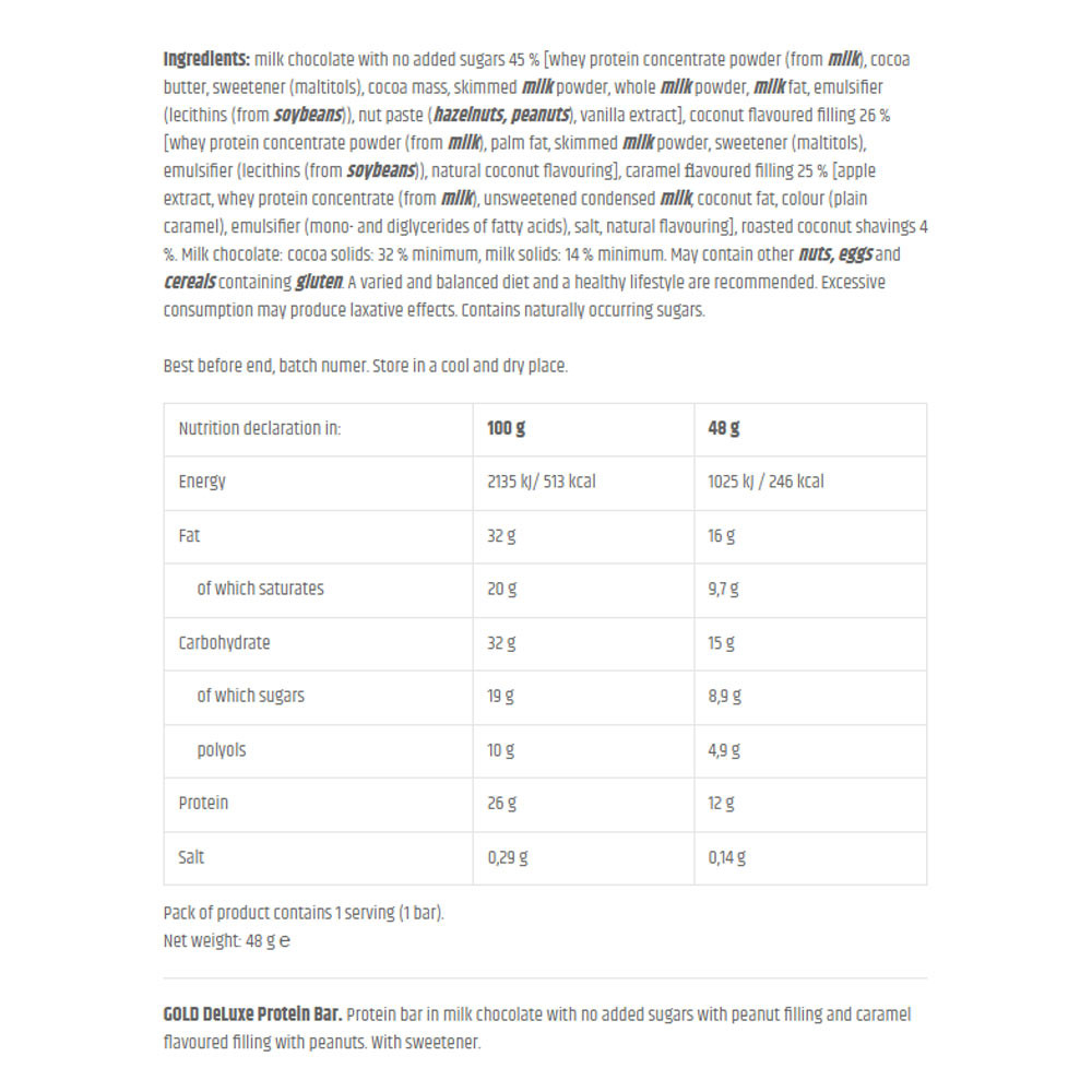 Ingredients: milk chocolate with no added sugars 45 % [whey protein concentrate powder (from milk), cocoa butter, sweetener (maltitols), cocoa mass, skimmed milk powder, whole milk powder, milk fat, emulsifier (lecithins (from soybeans)), nut paste (hazelnuts, peanuts), vanilla extract], coconut flavoured filling 26 % [whey protein concentrate powder (from milk), palm fat, skimmed milk powder, sweetener (maltitols), emulsifier (lecithins (from soybeans)), natural coconut flavouring], caramel flavoured filling 25 % [apple extract, whey protein concentrate (from milk), unsweetened condensed milk, coconut fat, colour (plain caramel), emulsifier (mono- and diglycerides of fatty acids), salt, natural flavouring], roasted coconut shavings 4 %. Milk chocolate: cocoa solids: 32 % minimum, milk solids: 14 % minimum. May contain other nuts, eggs and cereals containing gluten. A varied and balanced diet and a healthy lifestyle are recommended. Excessive consumption may produce laxative effects. Contains naturally occurring sugars.