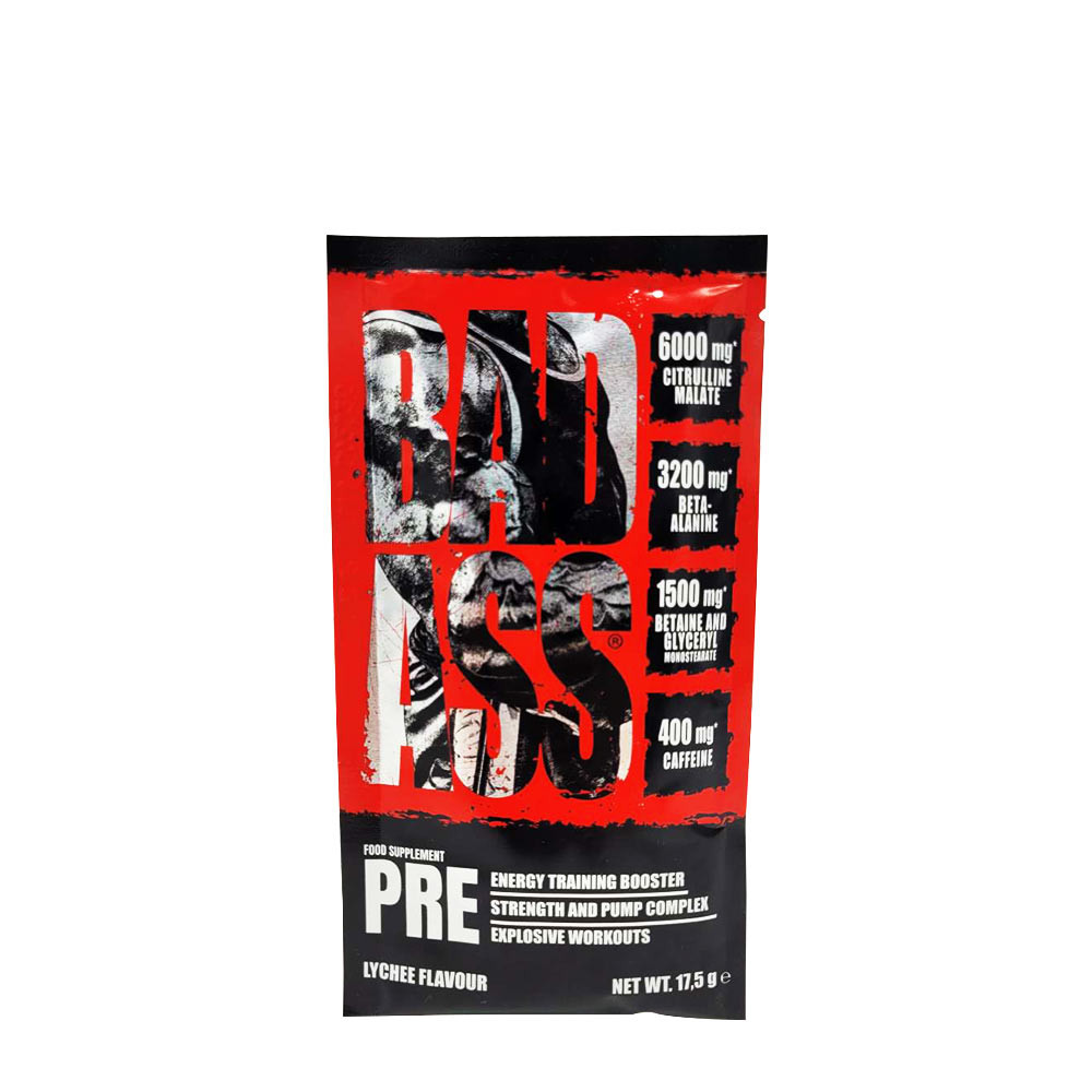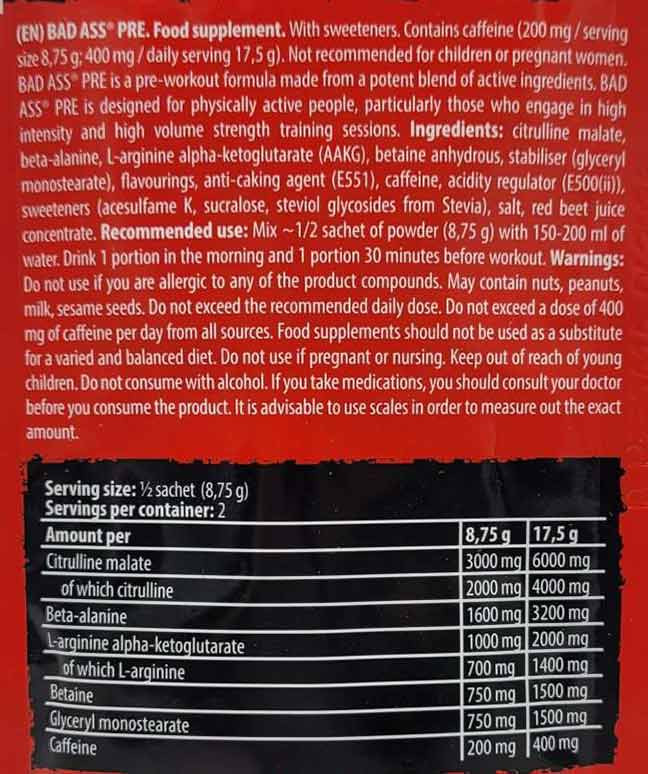 Contains ca_eine (200 mg / serving size 8,5 g 400 mg / serving size 17 g). Not recommended for children or pregnant women. BAD ASS® PRE is a pre-workout formula made from a potent blend of active ingredients. BAD ASS® PRE is designed for physically active people, particularly those who engage in high intensity and high volume strength training sessions.