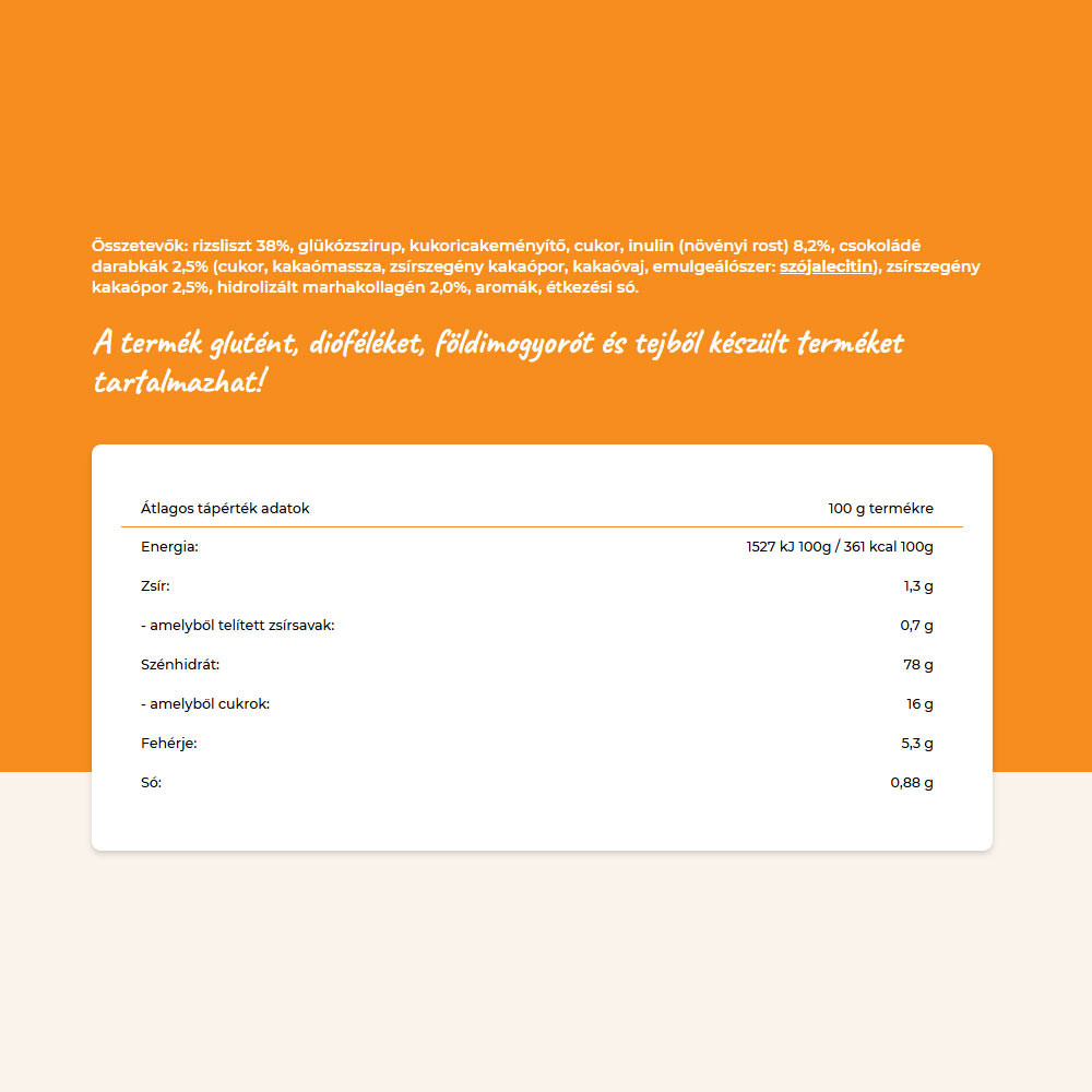 Ingredients: rice flour 38%, glucose syrup, corn starch, sugar, inulin (plant fiber) 8.2%, chocolate chips 2.5% (sugar, cocoa mass, low-fat cocoa powder, cocoa butter, emulsifier: soy lecithin), low-fat cocoa powder 2.5%, hydrolyzed bovine collagen 2.0%, flavorings, table salt.