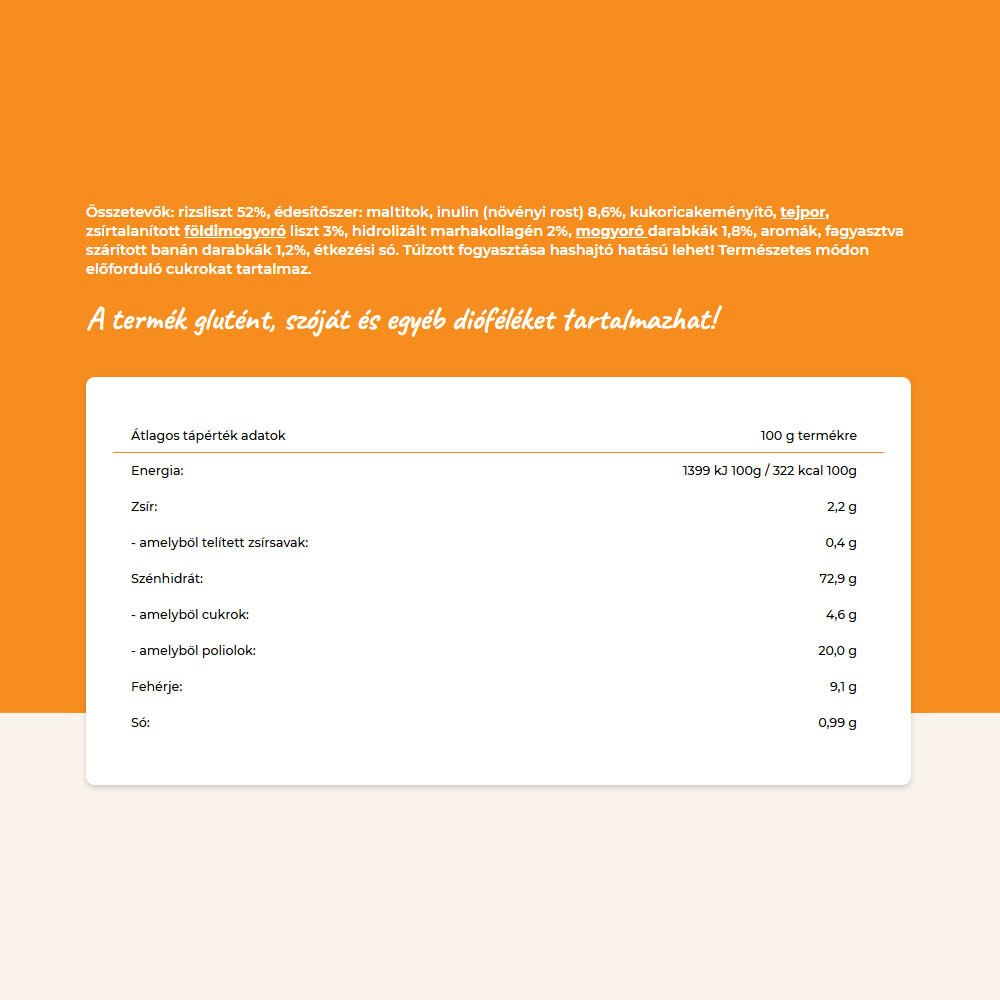 Ingredients: rice flour 52%, sweetener: maltitol, inulin (plant fiber) 8.6%, corn starch, milk powder, defatted peanut flour 3%, hydrolyzed bovine collagen 2%, peanut pieces 1.8%, flavorings, freeze-dried banana pieces 1.2%, table salt. Excessive consumption may have a laxative effect! Contains naturally occurring sugars.
