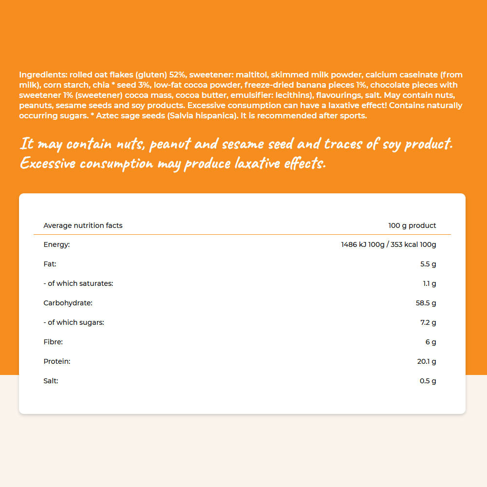 Ingredients: rolled oat flakes (gluten) 52%, sweetener: maltitol, skimmed milk powder, calcium caseinate (from milk), corn starch, chia * seed 3%, low-fat cocoa powder, freeze-dried banana pieces 1%, chocolate pieces with sweetener 1% (sweetener) cocoa mass, cocoa butter, emulsifier: lecithins), flavourings, salt. May contain nuts, peanuts, sesame seeds and soy products. Excessive consumption can have a laxative effect! Contains naturally occurring sugars. * Aztec sage seeds (Salvia hispanica). It is recommended after sports.