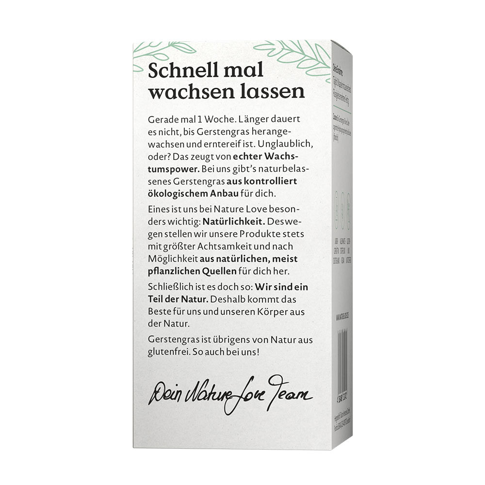 Just 1 week. That’s all it takes for barley grass to grow and be ready to harvest. Incredible, isn’t it? That’s real growth power. With us, you get natural barley grass from controlled organic cultivation. By the way, barley grass is naturally gluten-free – and so is ours!