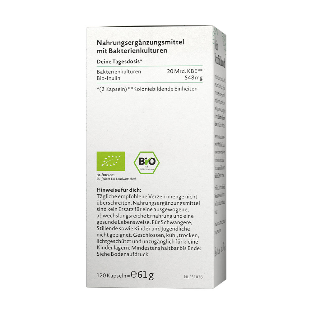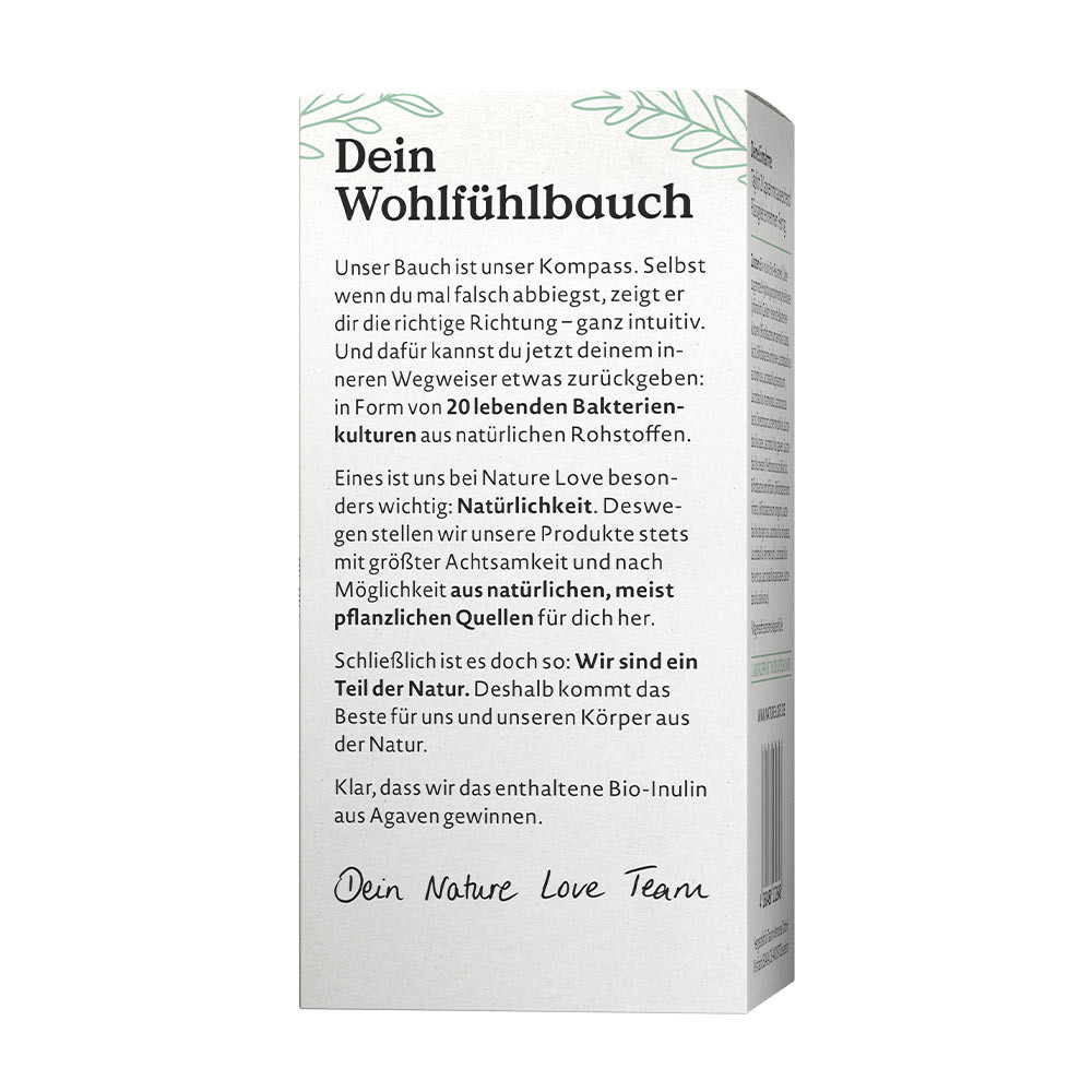 Our belly is our compass. Even if you take a wrong turn, it shows you the right direction – quite intuitively. And now you can give something back to your inner guide: with our 20 live bacterial cultures from natural raw materials and organic inulin from controlled organic cultivation.
