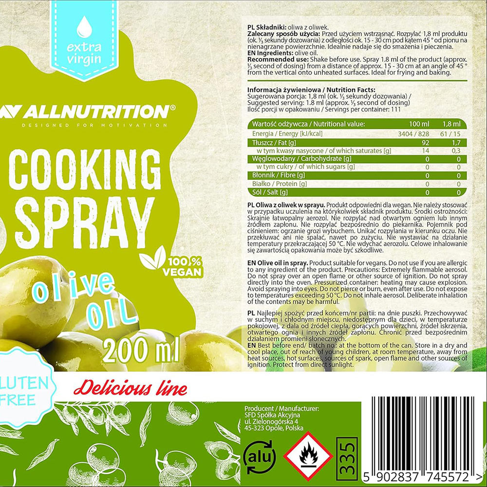 ALLNUTRITION COOKING SPRAY OLIVE OIL is designed for those who value a healthy lifestyle and delicious home-cooked meals. Its sole ingredient is olive oil, well-known for its distinctive taste and beneficial health properties. It is rich in essential unsaturated fatty acids and contains valuable compounds such as polyphenols, as well as vitamins E and K.