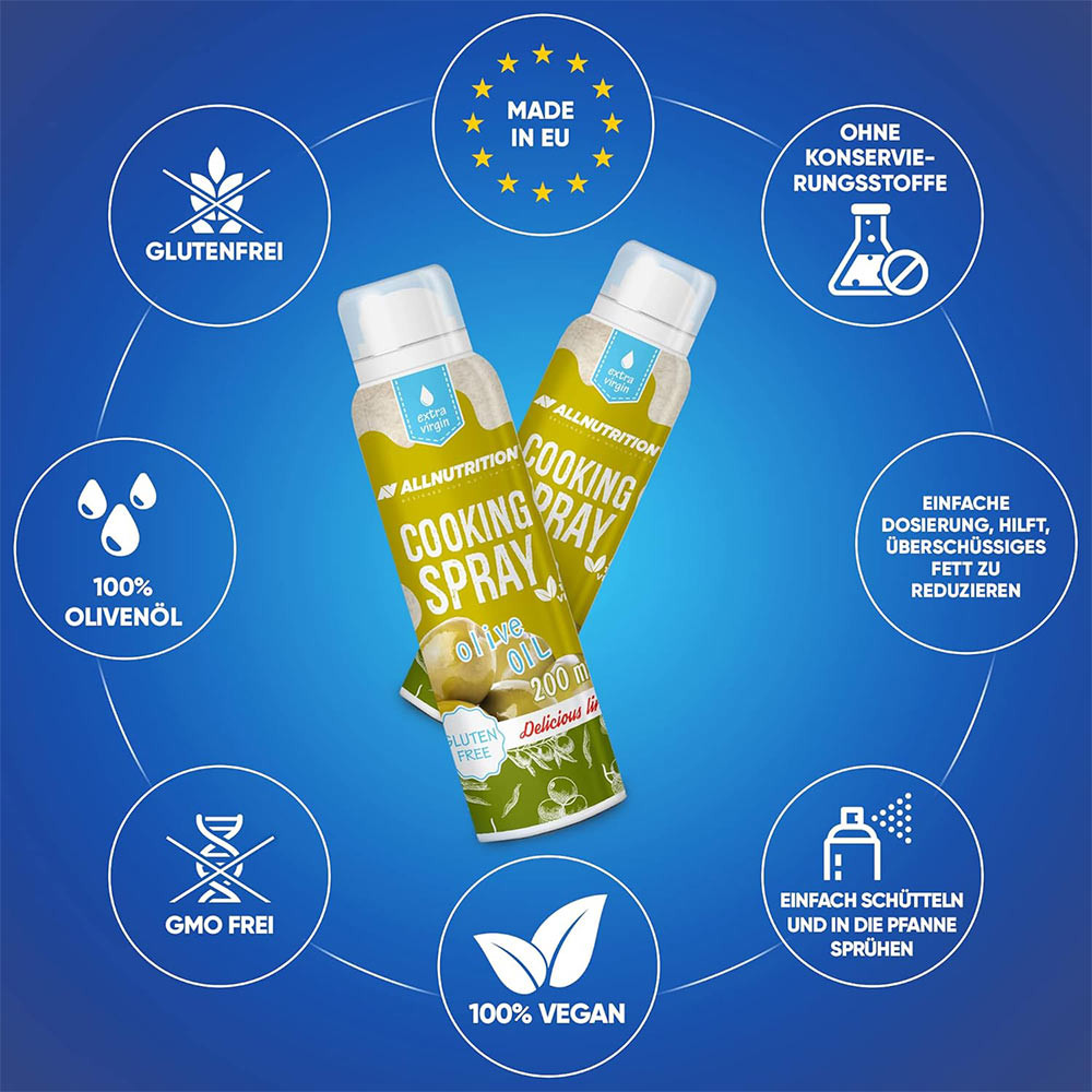ALLNUTRITION COOKING SPRAY OLIVE OIL adds a delicate olive flavor and aroma to your dishes, making them not only healthier but also more delicious. It is the perfect choice for those who enjoy the taste of olive oil while paying attention to their health and diet.