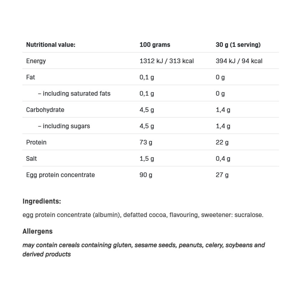 EGG WHITE PROTEIN is a high-quality supplement based on egg white concentrate – an excellent alternative to classic whey protein supplements. Thanks to its high biological value, optimal amino acid profile, and absence of added sugar, it supports active individuals while being the perfect choice for those intolerant to WPC-based supplements.