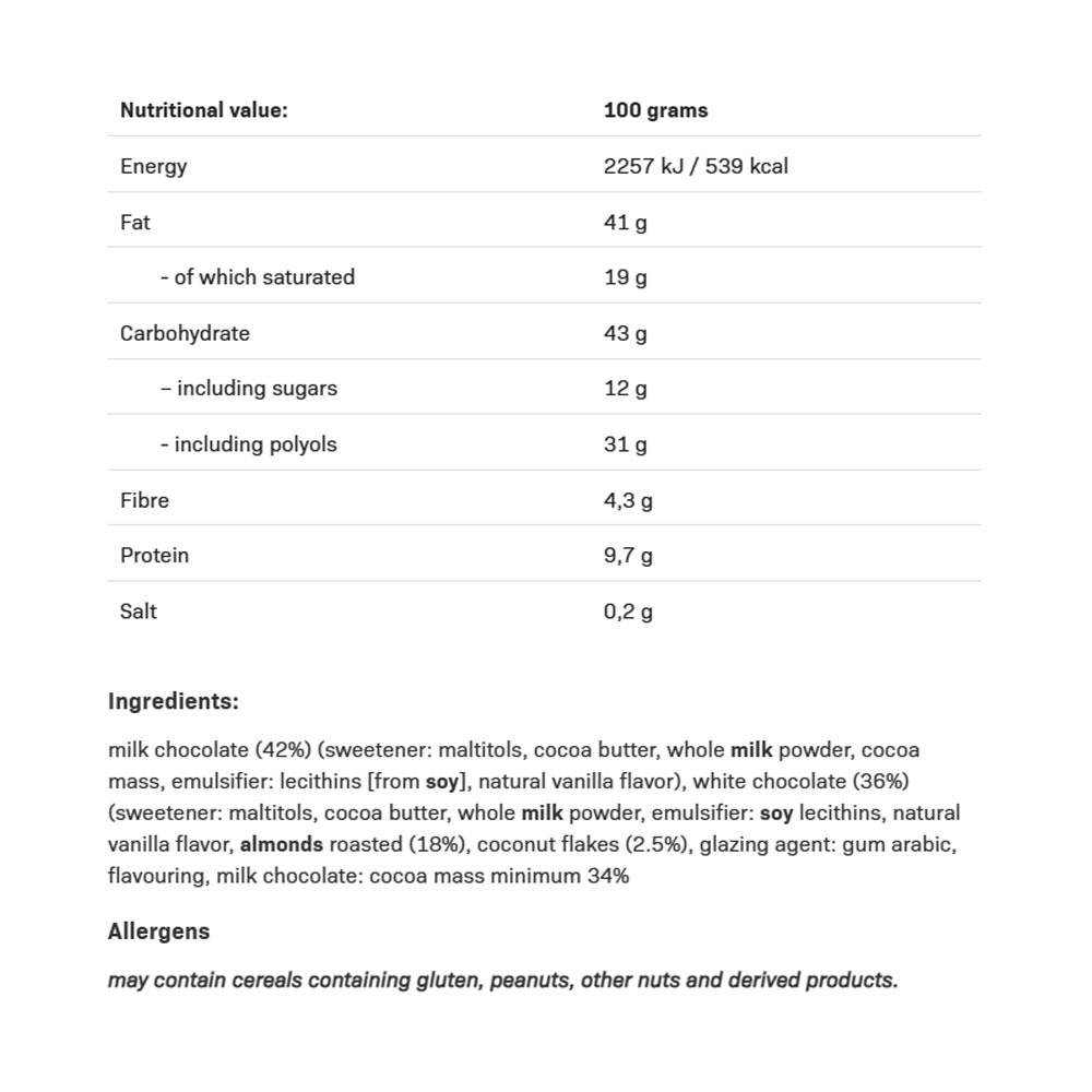 Almonds in milk chocolate and white chocolate, with no added sugar. Contains sweetener. Contains naturally occurring sugars. Do not consume if you are allergic to any of the ingredients. Excessive consumption may have a laxative effect. Not suitable for children under 3 years of age due to the risk of choking.