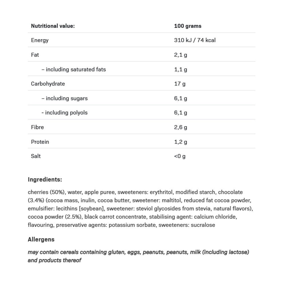 ALLNUTRITION Choco In Jelly Cherry is juicy cherries in chocolate jelly, also known as Frużelina. Choco In Jelly Cherry has a light, jelly-like texture in which we dipped ripe cherries, complemented by sweet, delicate chocolate.