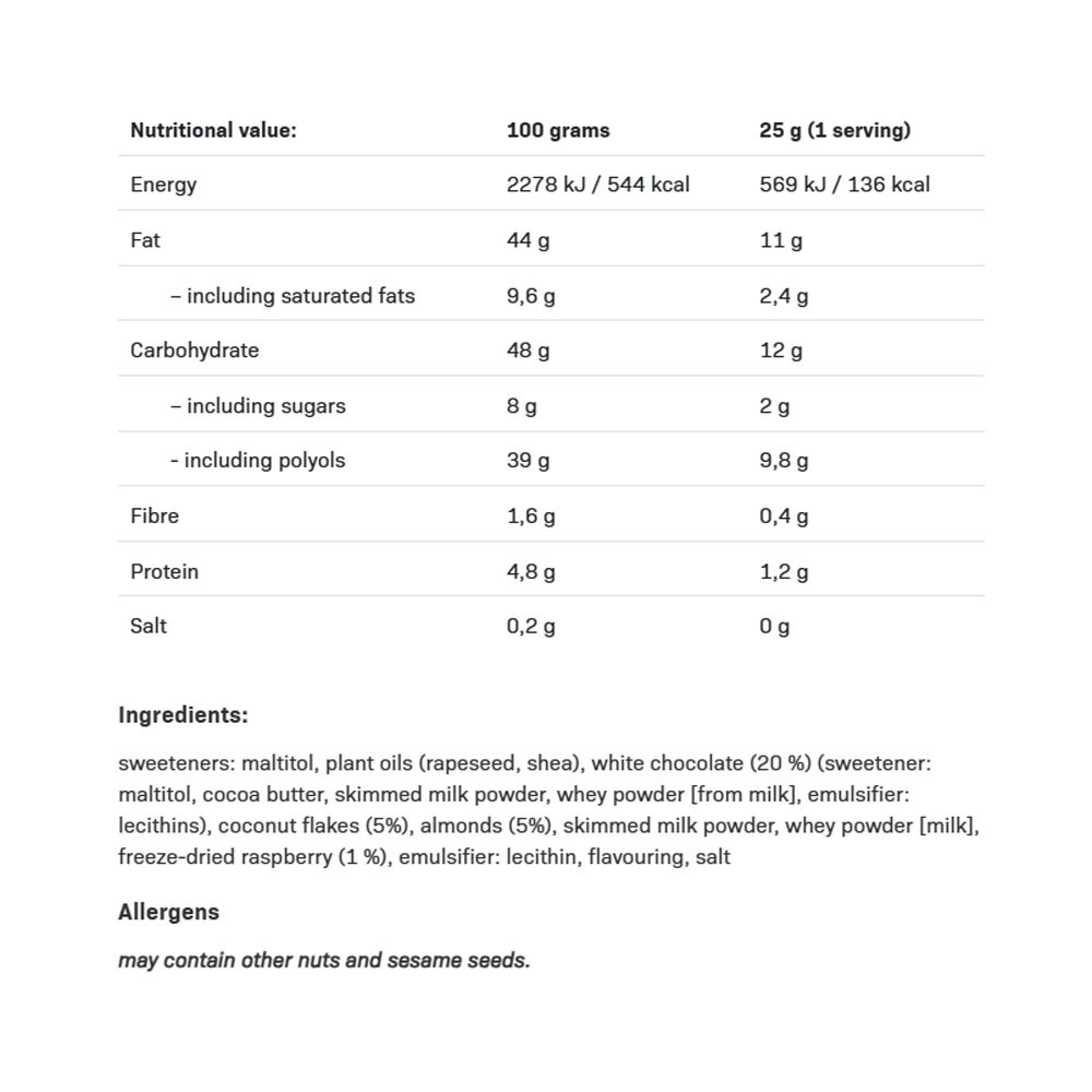 White chocolate-based cream with shredded coconut, almond pieces, and freeze-dried raspberries. Contains sweetener. No added sugar. Contains naturally occurring sugars. Do not consume if allergic to any of the ingredients. A balanced diet and healthy lifestyle are important. Excessive consumption may have a laxative effect. May contain shell fragments. Stir before use. May also contain other nuts and sesame seeds.