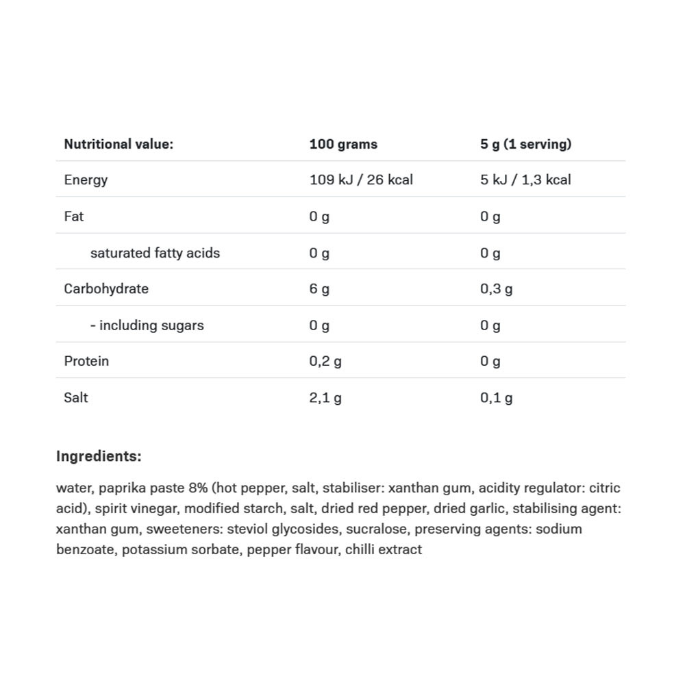 ALLNUTRITION SAUCE THAI SWEET CHILLI is a delicious, savory, aromatic, and low-calorie sauce. Sugar-free and fat-free. Available in the tasty Thai Sweet Chilli flavor, it’s the perfect addition to diet-friendly meals. A proven recipe and the highest quality ingredients guarantee a unique taste experience.