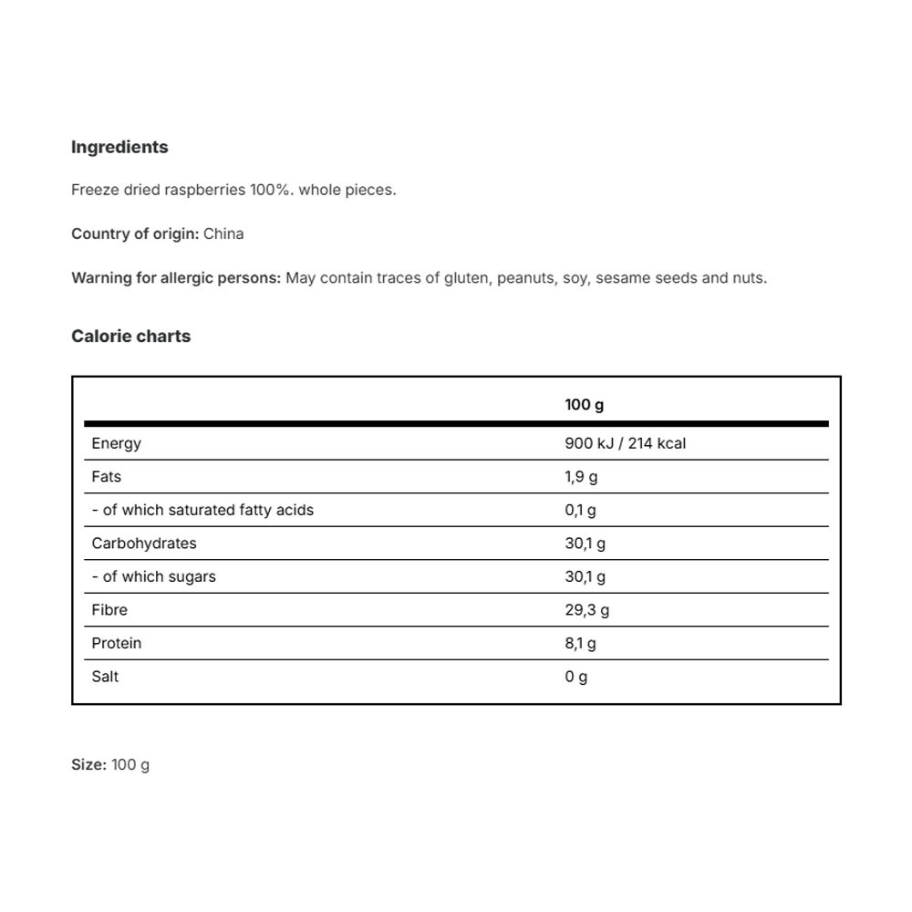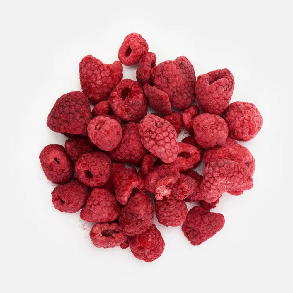 Freeze-dried raspberries with a light, crunchy texture and vibrant flavor, perfect as a healthy snack or breakfast topping